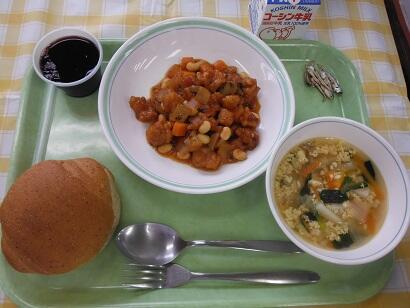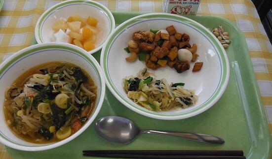牛乳・白飯・鶏肉の中華風ロースト・バンサンスウ・中華たまごスープ・フルーツ和え・大豆小魚