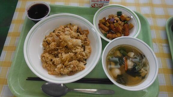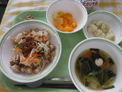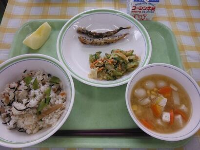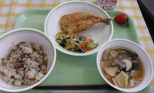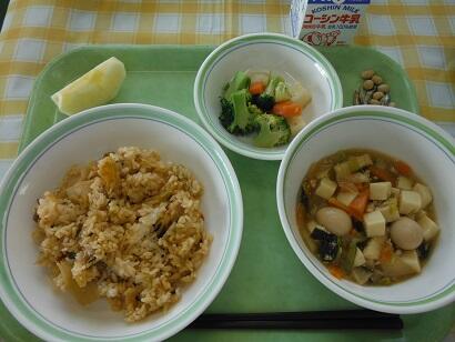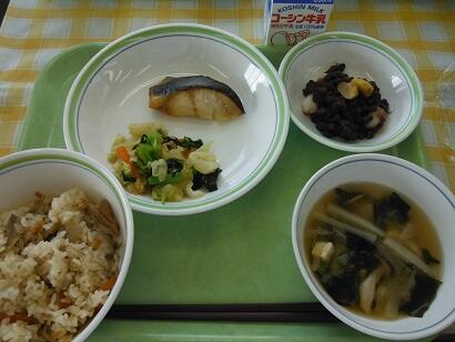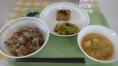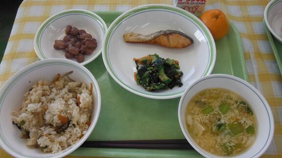 牛乳・かやくご飯・さけの照焼き・ほうれん草のごまみそ和え・かきたま汁・煮豆・ぽんかん