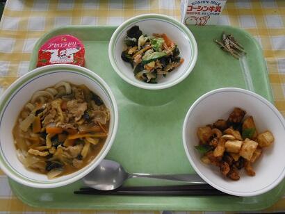 牛乳・カレーうどん・ツナとわかめの和え物・カシューナッツの揚げ煮・アセロラゼリー・小魚