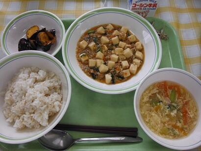 牛乳・白飯・麻婆豆腐・卵と春雨のスープ・大学芋・小魚