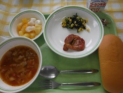 牛乳・胚芽パン・鶏肉と大豆のトマト煮・イタリアンスープ・グレープゼリー・小魚