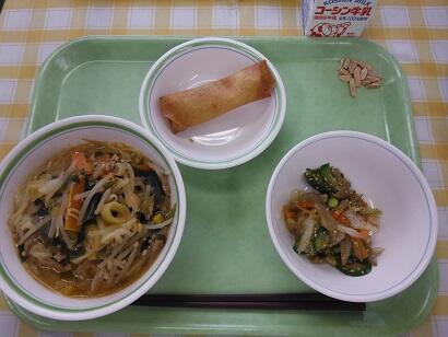 牛乳・味噌ラーメン・カシューナッツの揚げ煮・中華サラダ・杏仁豆腐・大豆小魚