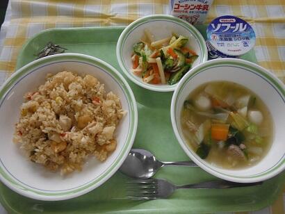 牛乳・ナシゴレン・さけの香味パン粉焼き・マセドアンサラダ・白菜とベーコンのスープ・煎り大豆