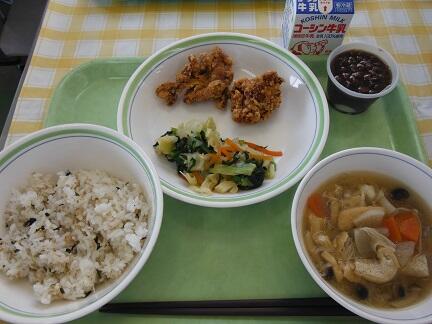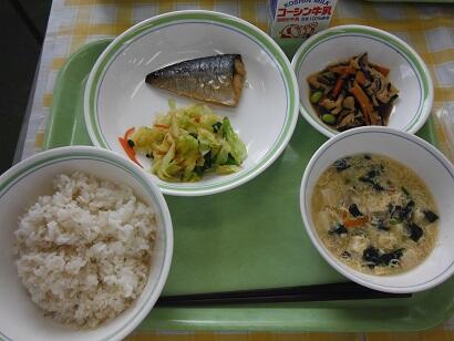 牛乳・ひじきと青大豆のご飯・さばの立田揚げ・おかかあえ・かきたま汁・みかん