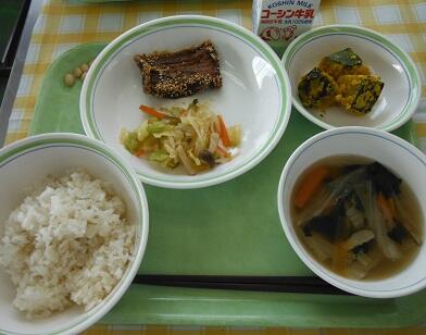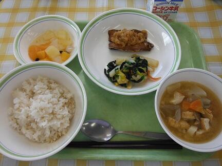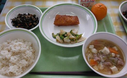 牛乳・白飯・さけの照り焼き・野菜のごま煮・豚汁・デコポン・大豆小魚