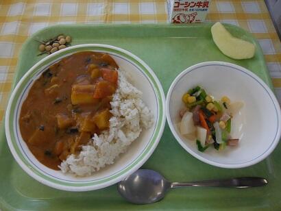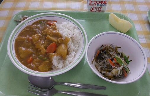牛乳・シーフードカレーライス・すき昆布と春雨のサラダ・りんご・大豆小魚