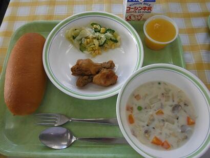 牛乳・二色揚げパン・コーンチャウダー・ひじきと青大豆のサラダ・ぽんかん