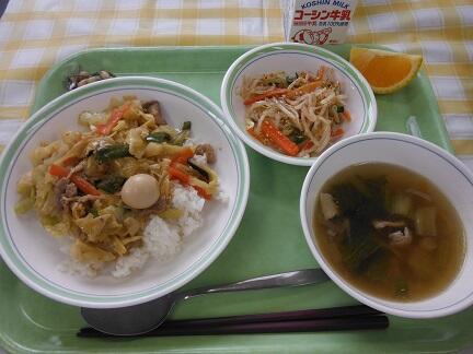 牛乳・中華丼・ひじきと青大豆のサラダ・白菜と豚肉スープ・黒糖アーモンド