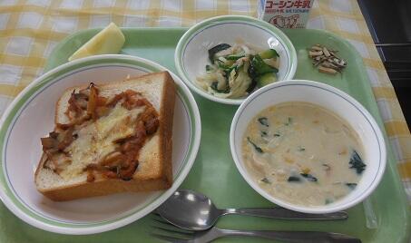 牛乳・胚芽パン・手作りりんごジャム・ポテトと青大豆のチーズ焼き・キャロットサラダ・コーンと卵のスープ