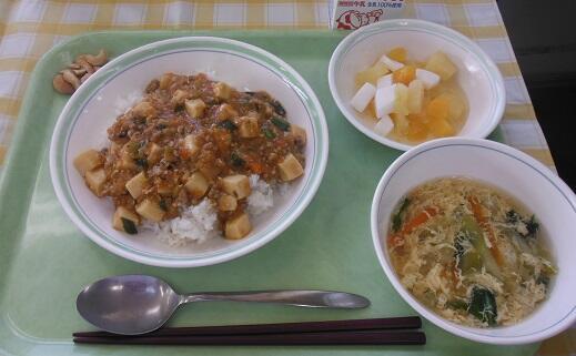 牛乳・マーボ豆腐丼・卵と春雨のスープ・フルーツ杏仁・カシューナッツ