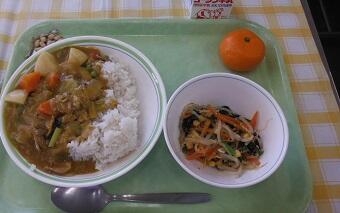 牛乳・ねぎとかぶのカレーライス・ゆで野菜のごまサラダ・みかん・大豆小魚