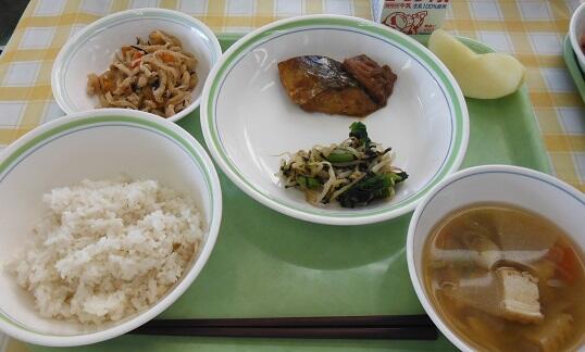 牛乳・白飯・さばの味噌煮・磯香あえ・切干大根の旨煮・けんちん汁・りんご