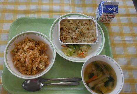 牛乳・チキンライス・さけとポテトのグラタン・キャベツのサラダ・