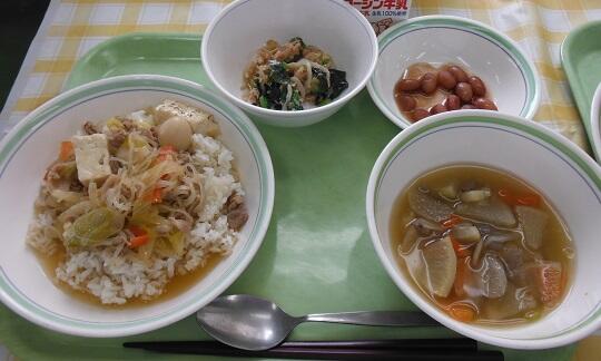 牛乳・すきやきどんぶり・ツナとわかめの和えもの・煮豆・呉汁