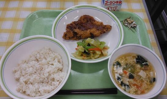 牛乳・ごはん・みそカツ・辛し和え・かきたま汁・大豆小魚