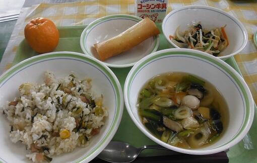 牛乳・野沢菜チャーハン・さけとチーズの春巻き揚げ・野菜のナムル・五目スープ・ぽんかん