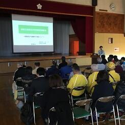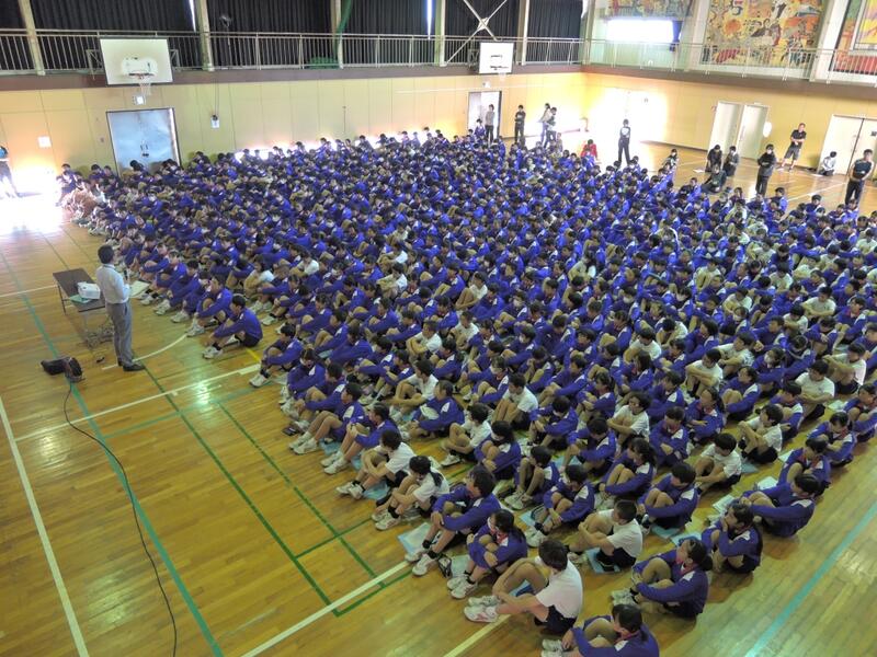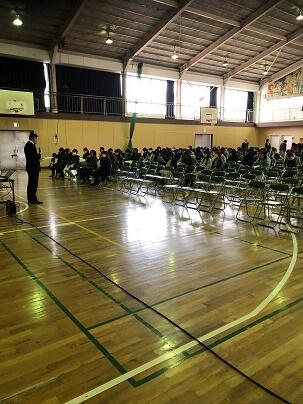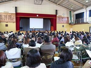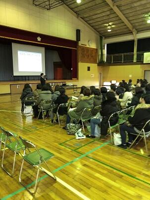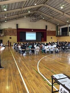 本日生徒は期末テストのため、午後は本校体育館で「地域防災研修会」を行いました。