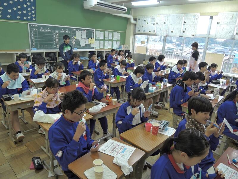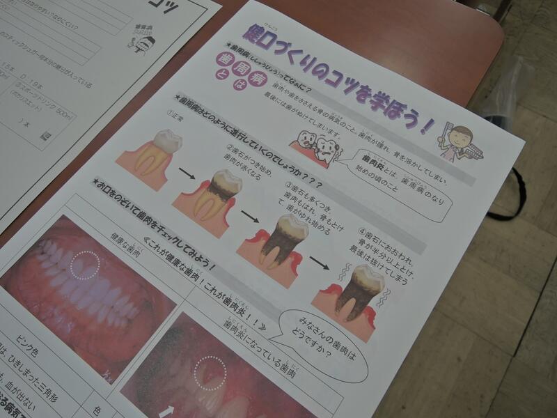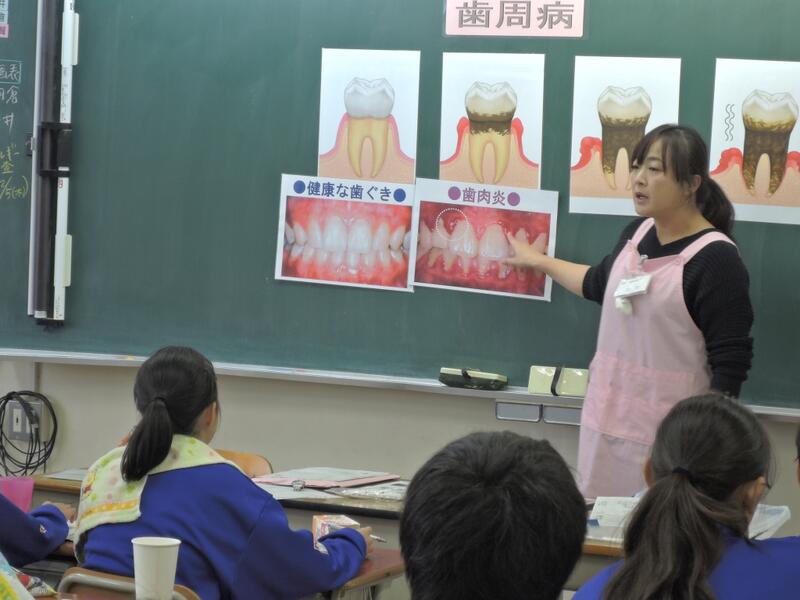 本日6校時、1年生は「歯の健康教室」(歯磨き指導)を行いました。各クラスに1名の歯科衛生士が担当して指導にあたってくださいました。