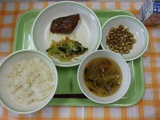 牛乳 ご飯 鯖のごまみそ煮 ピリ辛おひたし 沢煮椀 カリカリ大豆