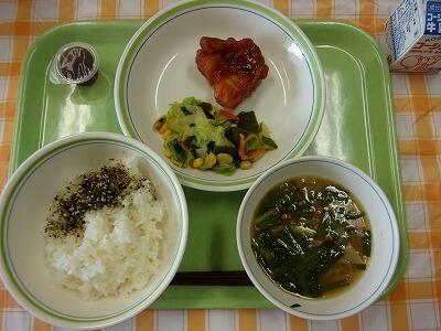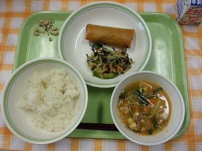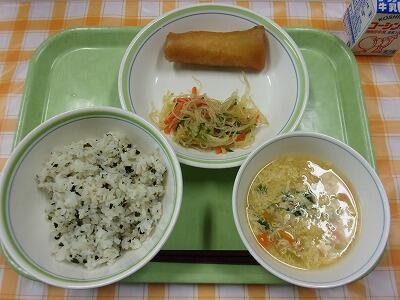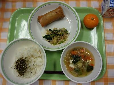 牛乳 ご飯 ごまふりかけ 手作り春巻き おひたし チンゲン菜のスープ みかん