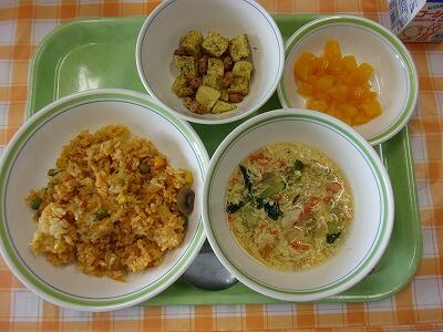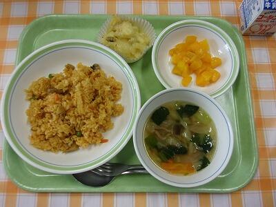 牛乳 メキシカンライス 青のりポテトビーンズ 卵とにんじんのスープ 黄桃缶