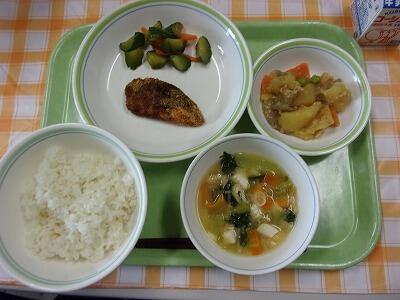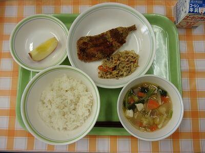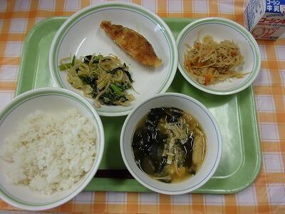 牛乳 ご飯 鯵フライ きゅうりの南蛮漬け じゃがいものそぼろ煮 小松菜と油揚げのみそ汁