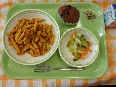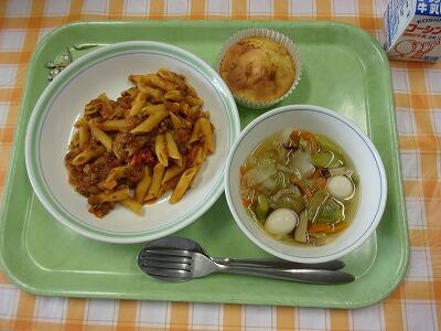 牛乳 ペンネアラビアータ アスパラとベーコンのスープ パイナップルケーキ 小魚