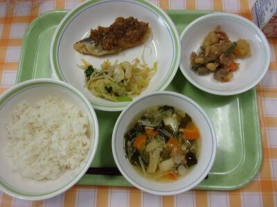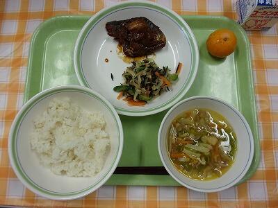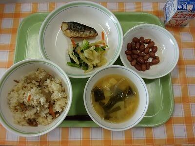 牛乳 ご飯 鯖のカレー焼き 野菜の塩昆布和え 金時豆の甘煮 みそけんちん汁