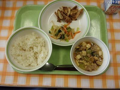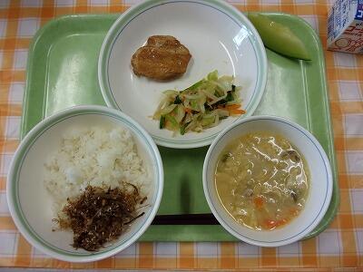 牛乳 大豆ご飯 竹輪の磯辺揚げ キャベツときゅうりのごま酢和え のっぺい汁 みかん