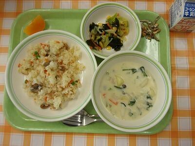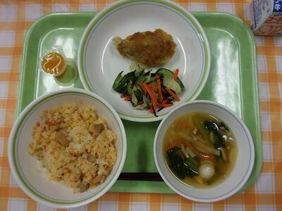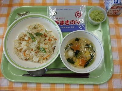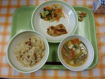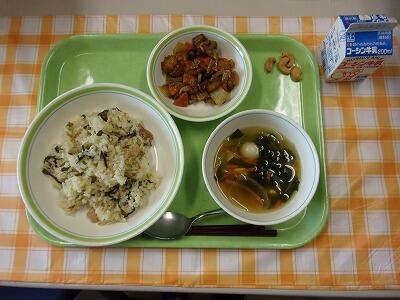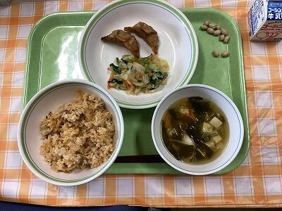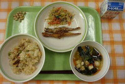牛乳 ひじきと青大豆のご飯 ししゃものから揚げ 白菜のおかか和え かきたま汁 カシューナッツ