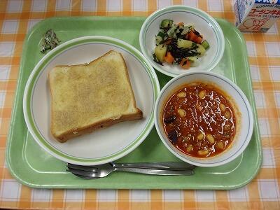 牛乳 セサミトースト ひじきとじゃがいものサラダ チリコンカン 小魚