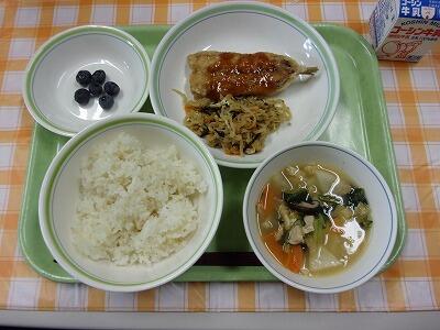 牛乳 ひじきと青大豆のご飯 白身魚のレモンソースかけ キャベツときゅうりのごま酢和え なめこのみそ汁 ひとくちぶどうゼリー
