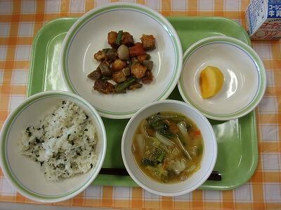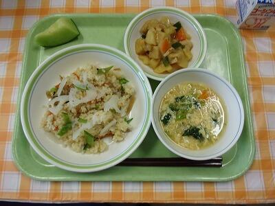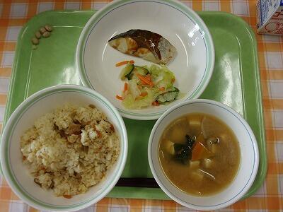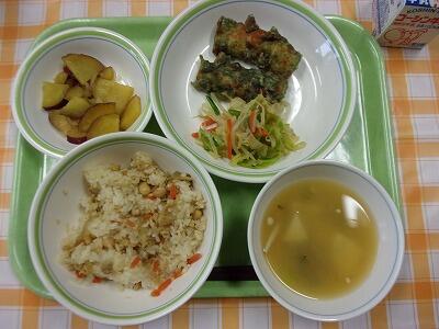 牛乳 大豆ご飯 竹輪の磯辺揚げ 辛し和え かぶのみそ汁 さつまいもとりんごの甘煮