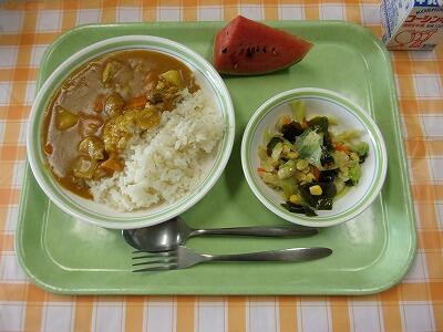 牛乳 ポークカレーライス 青大豆サラダ すいか