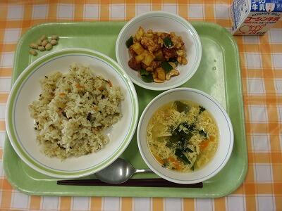 牛乳 高菜ちりめんチャーハン 鶏肉とカシューナッツの揚げ煮 卵とわかめのスープ いり大豆