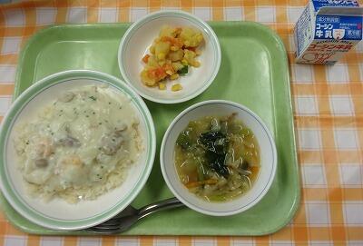 牛乳 えびクリームライス じゃがいものみそサラダ 千切り野菜スープ