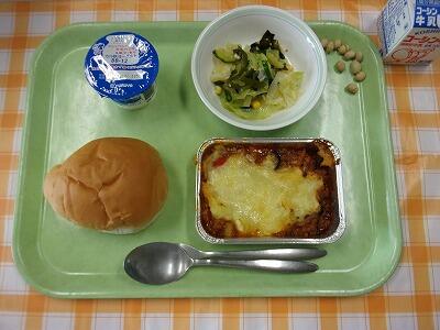 牛乳 テーブルロール 夏野菜のシェパーズパイ わかめときゅうりのサラダ ヨーグルト いり大豆