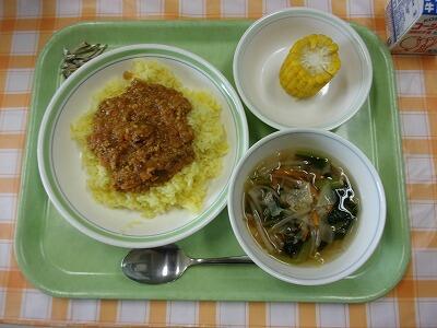 牛乳 ドライカレーライス 柏市産とうもろこし もやしとベーコンのスープ 小魚
