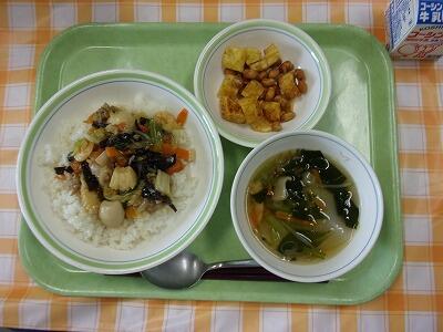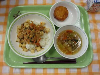 牛乳 厚揚げのピリ辛丼 五目スープ シュガーポテト 小魚