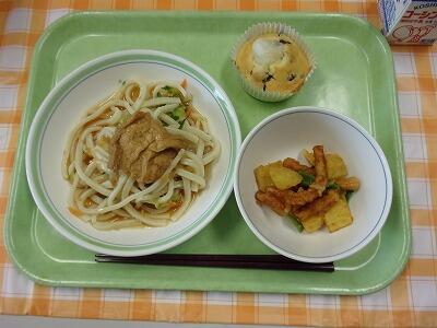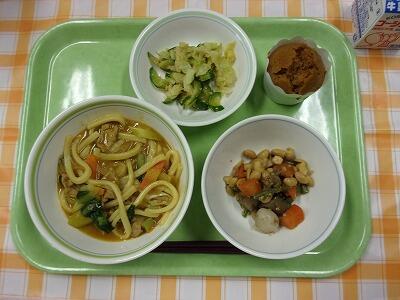 牛乳 カレーうどん キャベツときゅうりのごま酢和え 大豆と鶏肉の甘辛煮 栗入り黒糖蒸しパン