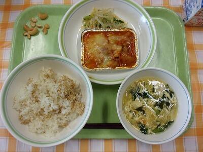 牛乳 揚げ大豆とじゃこのご飯 鶏肉のマーマレード焼き チンゲン菜のおひたし みそけんちん汁 カシューナッツ