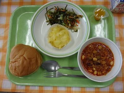 牛乳 テーブルロール ポテトのチーズ焼き すき昆布サラダ チリコンカン ひとくちみかんゼリー