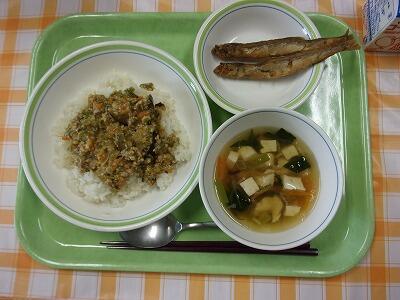 牛乳 なす入り肉みそ丼 ししゃものから揚げ 春雨スープ