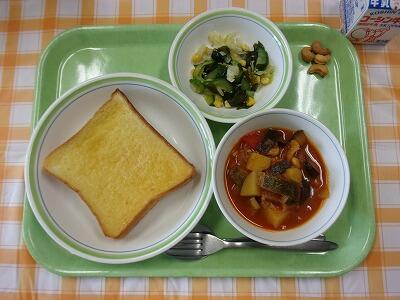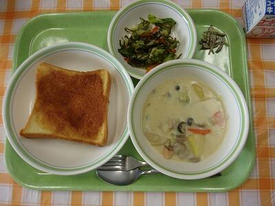 牛乳 シナモントースト 秋味のクリームシチュー すき昆布サラダ 小魚