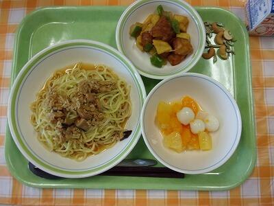 牛乳 冷やし中華 白身魚と野菜の揚げ煮 フルーツ白玉 カシューナッツ小魚