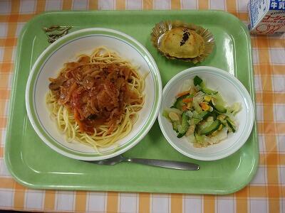 牛乳 なすとトマトのスパゲティ ひじきとじゃがいものサラダ もちもちパン いり大豆