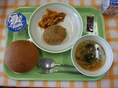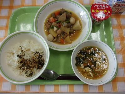 牛乳 ご飯 ひじきふりかけ 鰹とごぼうの旨煮 どさんこ汁 手作りアップルゼリー