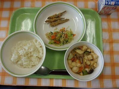牛乳 ご飯 豆腐の中華煮 きびなごのごまフライ 切干大根の中華サラダ