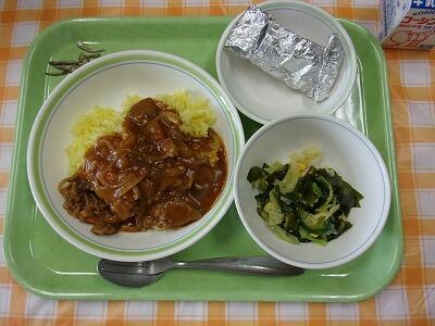 牛乳 チキンカレーライス 海そうサラダ 手作りオレンジゼリー 大豆小魚