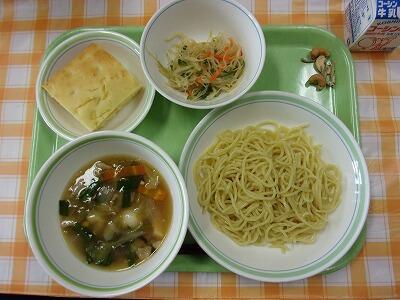 牛乳 チャンポン麺 もやしと春雨のサラダ チーズとさつまいものケーキ カシューナッツ小魚